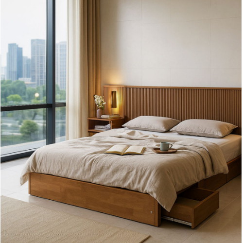 BIF보루네오 템바몰딩 3서랍 원목 수납 침대 K+사이드협탁조명1개 (매트별도)