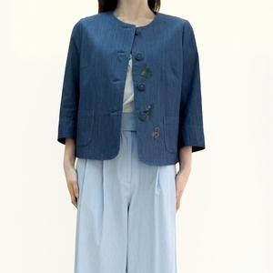 비꼴리끄 여성 컬러 데님 자수 카라리스 자켓 B252DJ2080